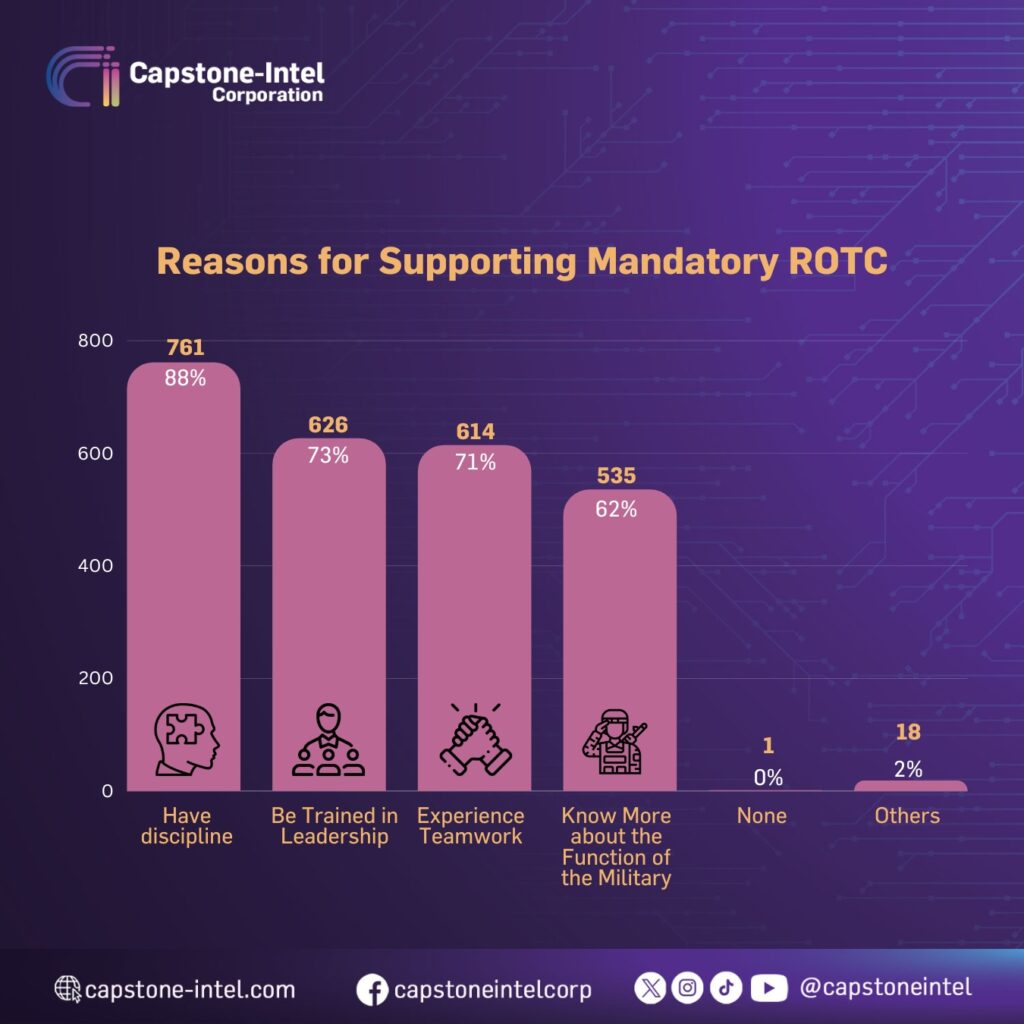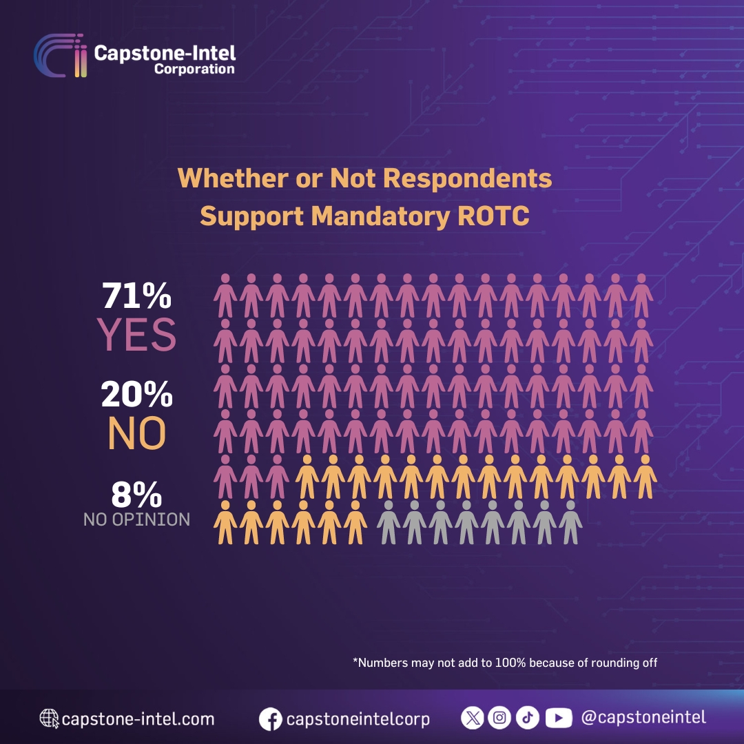 The government is considering reinstating the mandatory Reserve Officers’ Training Corps (ROTC) program. This initiative aims to enhance the preparedness of senior high school students in terms of patriotism, nationalism, national defense, and disaster preparedness. To gather insights on this matter, Capstone-Intel Corporation conducted a survey to assess the knowledge and perceptions of Filipino adults.