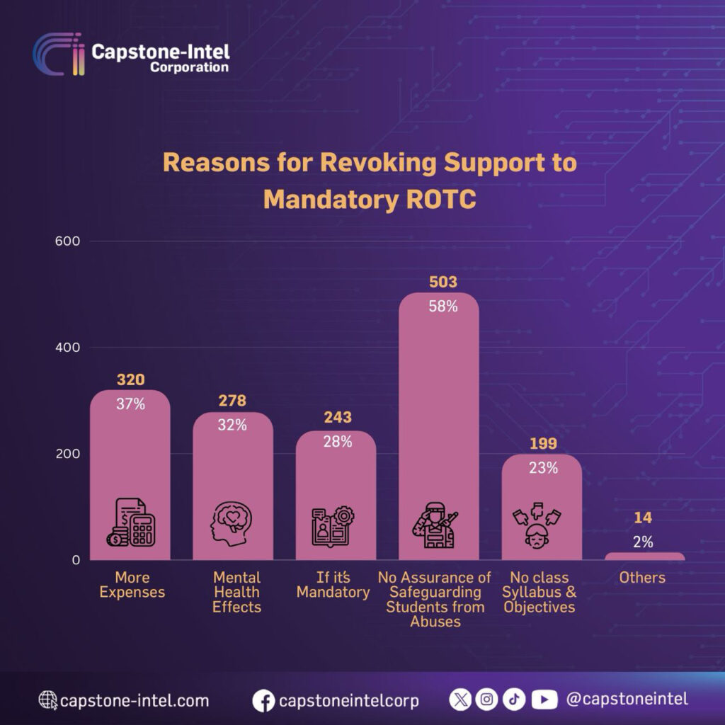 While over 71% supports the revival of ROTC, there are still reasons why they can change their minds. The top reason is that no assurance of safeguarding students from abuses (58%), followed by more expenses (37%), mental health effects (32), and if it is mandatory (28%).