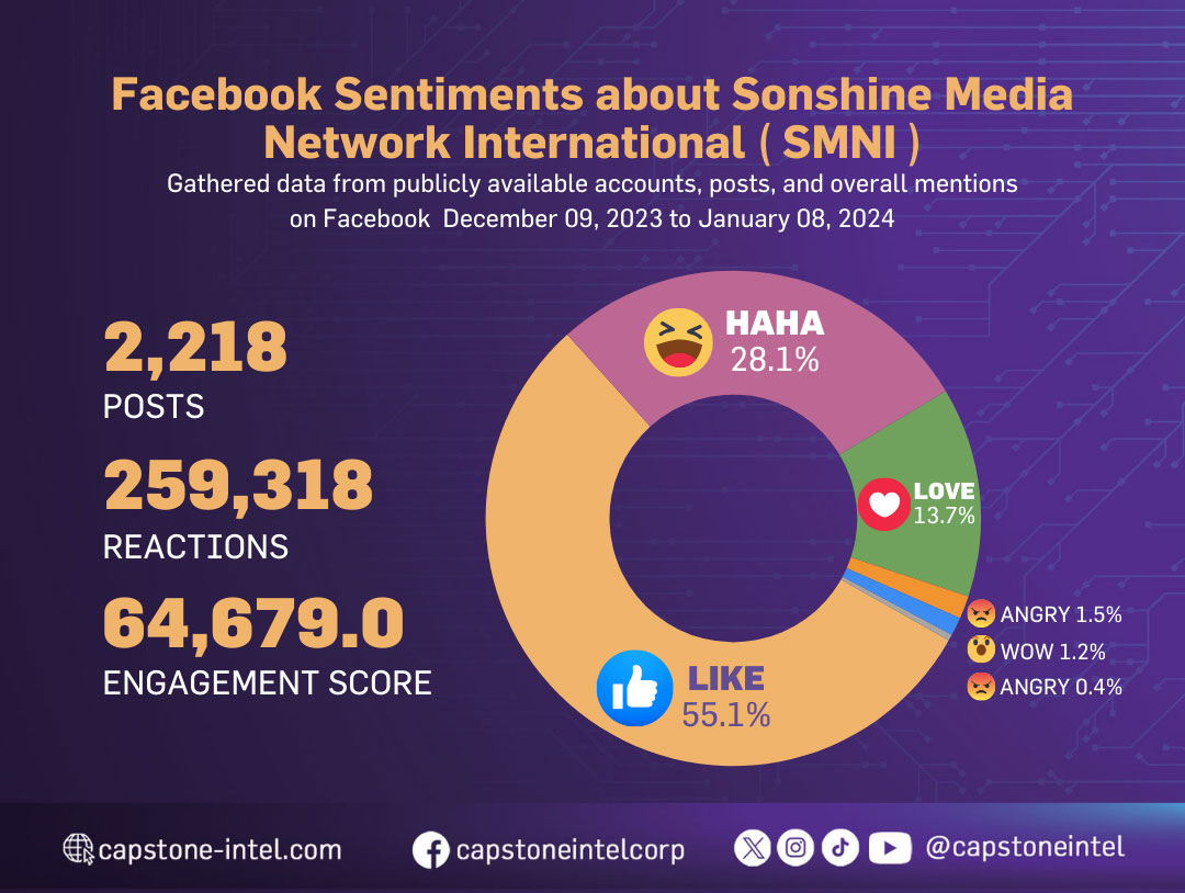 Capstone-Intel Corp. examined the online presence of SMNI in the country as a topic of discussion over the month, from December 9, 2023, to January 8, 2024, by utilizing all publicly accessible posts from social and non-social media platforms in order to gather the sentiments of the media agency at the height of its controversy.