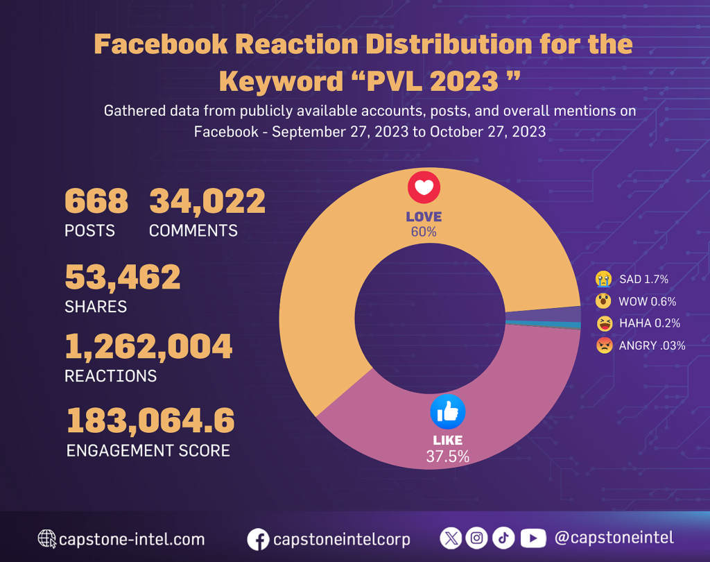 The study was conducted from September 27, 2023 to October 27, 2023. Capstone-Intel utilized its social listening tools to scan publicly available Facebook pages for posts mentioning “PVL 2023.” In this study, there were no specific demographics or personal data that were tracked.