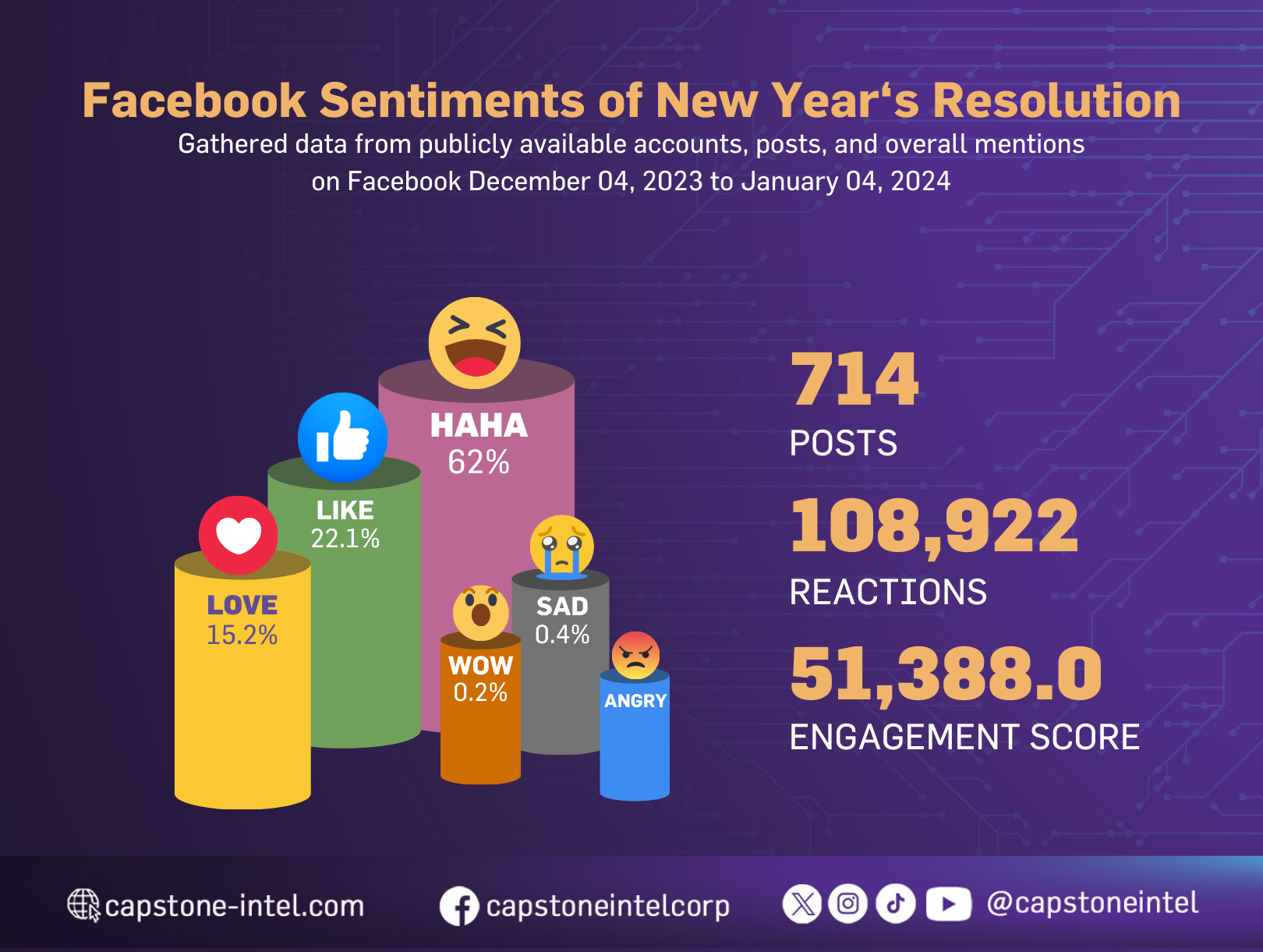 Capstone-Intel Corp. examined the online presence of new year’s resolution in the country as a topic of discussion over the month, from December 4, 2023, to January 4, 2024, by utilizing all publicly accessible posts from social and non-social media platforms in order to gather the sentiments of the public about the topic.