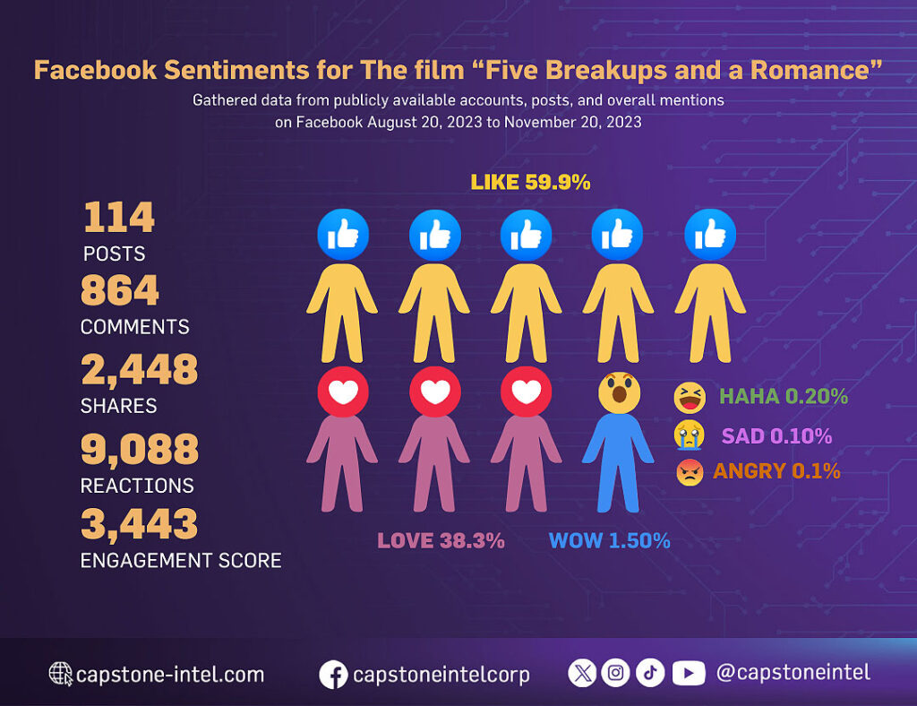 The study was conducted between August 20, 2023 and October 20, 2023. Capstone-Intel utilized its social listening tools to scan publicly available Facebook pages for the posts mentioning “5 Breakups and a Romance.” In this study, there were no specific demographics or personal data that were tracked.