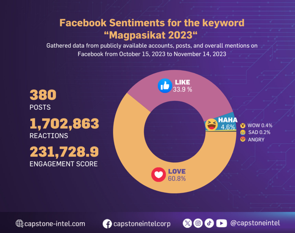 Capstone-Intel Corp. examined the online presence of “Magpasikat 2023” for one month, from October 14, 2023, to November 13, 2023, by utilizing all publicly accessible posts from social and non-social media platforms in order to gather the sentiments of the public about the concept.
