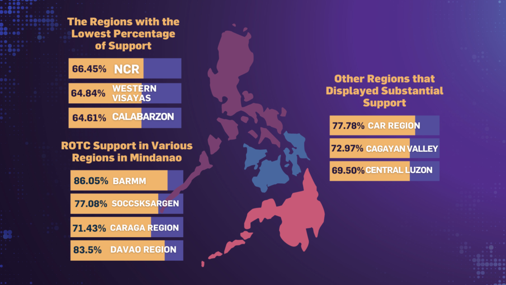 Upon careful analysis of the collected data, it became evident that there is significant support for the revival of the ROTC program, particularly in the Mindanao regions. The support levels varied from 71.43% to 86.05%.