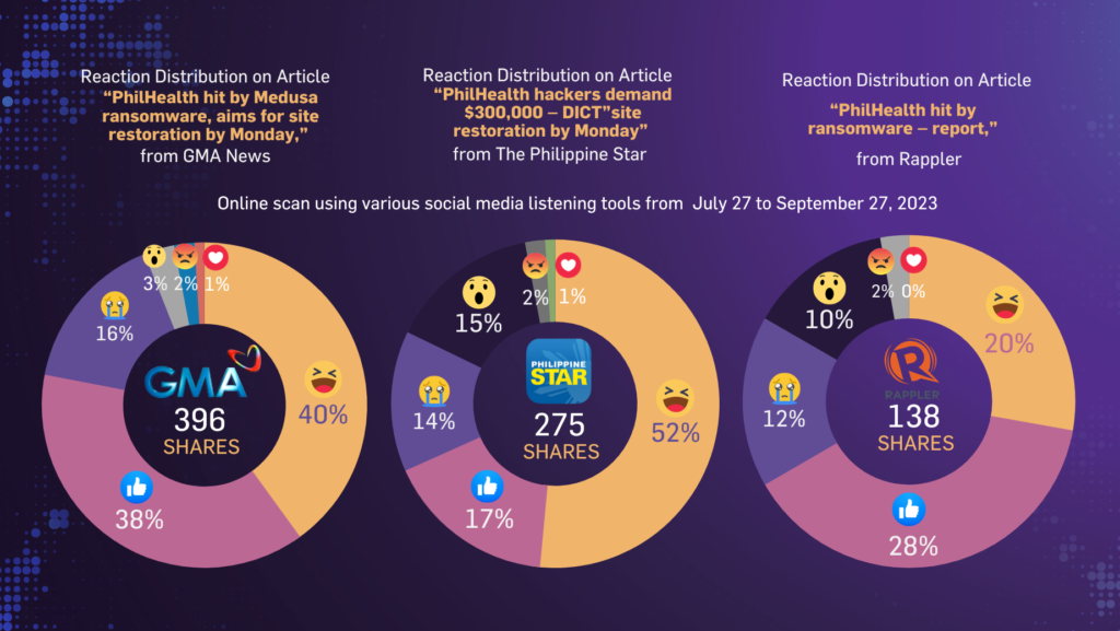 Furthermore, Rappler has also the public’s reactions from its news report, “PhilHealth hit by ransomware – report,” with 28 Likes, 20 Haha, 12 Sad, 10 Wows, 2 Angry, 0 Love, and 138 shares.