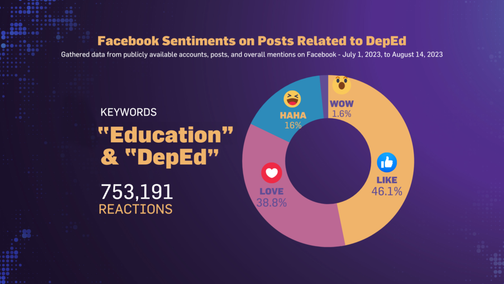 After studying the performance of the keywords “Education” and “DepEd” together on Facebook, it yielded a total of 753,191 reactions. 46.1 percent are Facebook Likes, 34.8 percent are Facebook Hearts/Loves, 34.8 percent are Facebook Love, 16 percent are Haha reactions, and the last 1.6 percent fall under Facebook Wow. This result emphasizes that the audience generally maintains a more neutral response to the issue at hand.