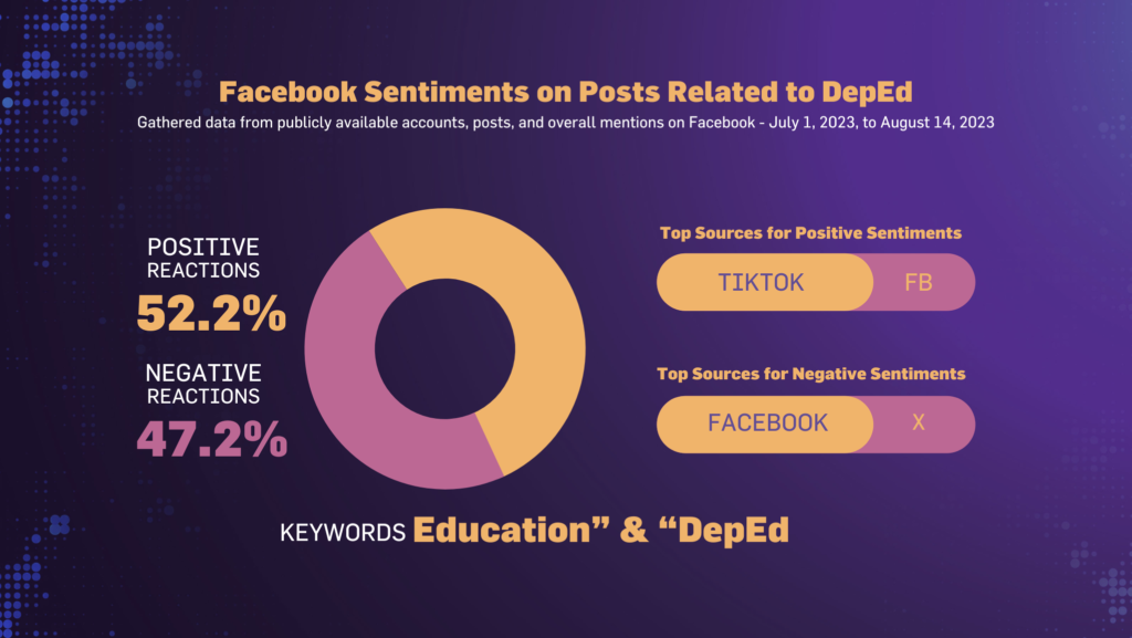 In terms of the general sentiments on “DepEd” and “Education”, the split is much more obvious, with 52.2 percent of sentiments seeming to lean on the positive end of things, while the other 47.8 percent are more on the adverse side. This data comes from the various social media accounts that Capstone-Intel was able to scan and sift through.