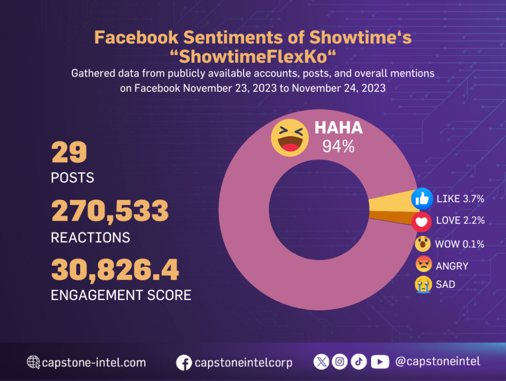 Capstone-Intel Corp. examined Showtime’s “#ShowtimeFlexKo” online presence for one day, from November 23, 2023, to November 24, 2023, by utilizing all publicly accessible posts from social and non-social media platforms in order to gather the sentiments of the public about the said hashtag over the past 24 hours.