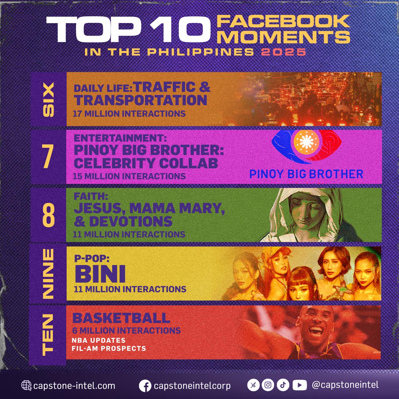 With 2025 now behind us, Filipinos turned to Facebook to share, react to, and debate the events that defined the year. From natural disasters and political controversies to reality TV highlights and everyday life, the platform captured both tragedy and triumph, worry and celebration. Data from Capstone-Intel Corporation, generated January 5–6, 2026, reflects Facebook activity from 2025, shows the top 10 topics that drew the most engagement nationwide.